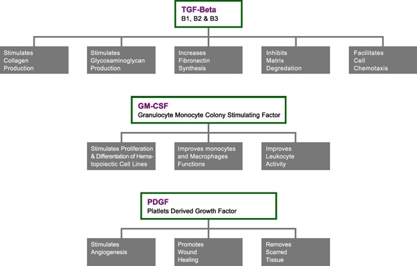 Since the work of Cohen and Levi-Montalcini, scientific research has built a knowledge base of types and functions of other major GF, including TGF-b (Transforming Growth Factor), PDGF (Platelet Derived Growth Factor), GM-CSF (Granulocyte-Macrophage Colony-Stimulating Factor), and IL (Interleukins). Medical research has found that GF can speed and improve healing when applied to areas of the human body damaged in surgery, burns, wounds, or accidents. The mechanism behind the benefits is facilitation of changes at the cellular level to revert damaged cells to a younger state, healing the damaged skin in the process.